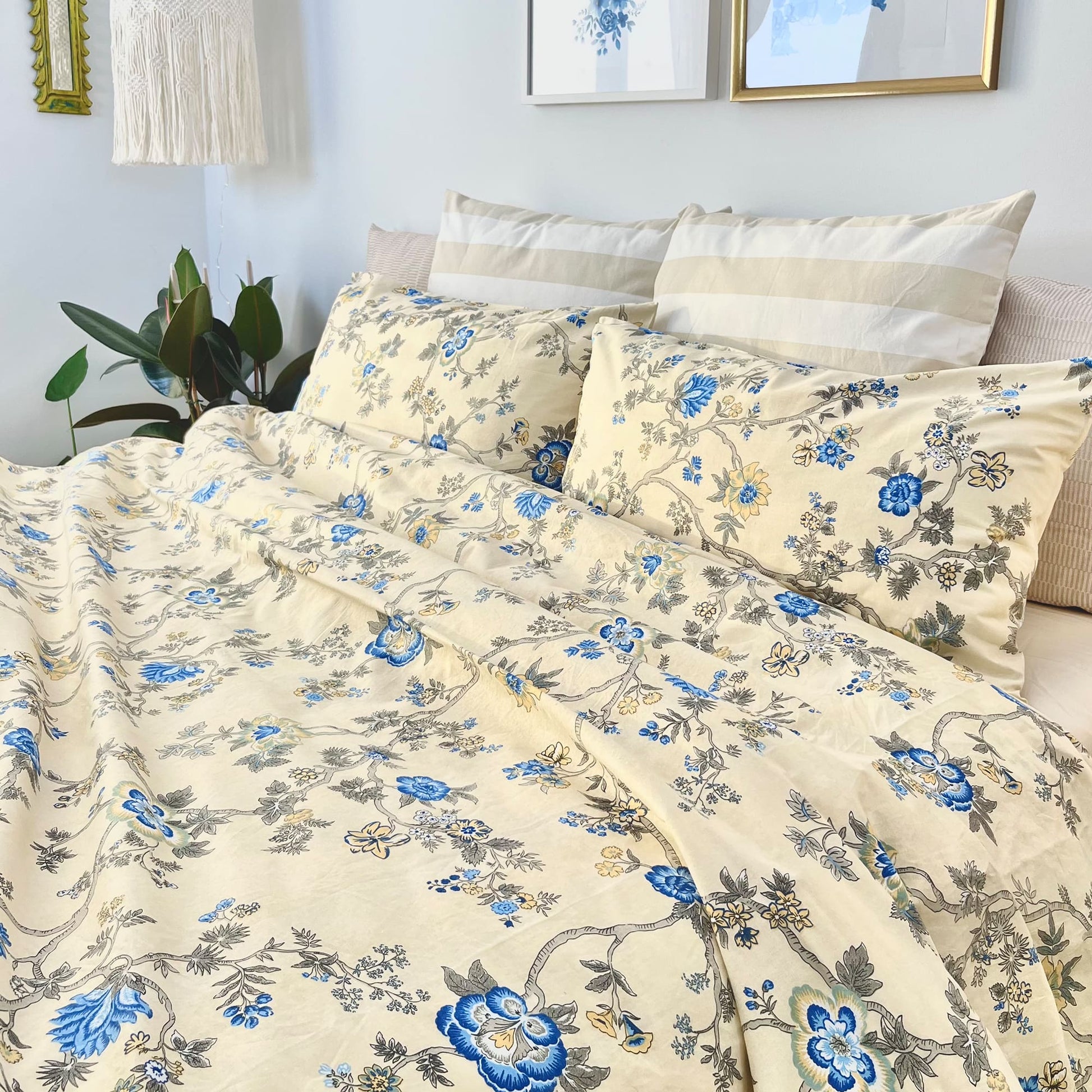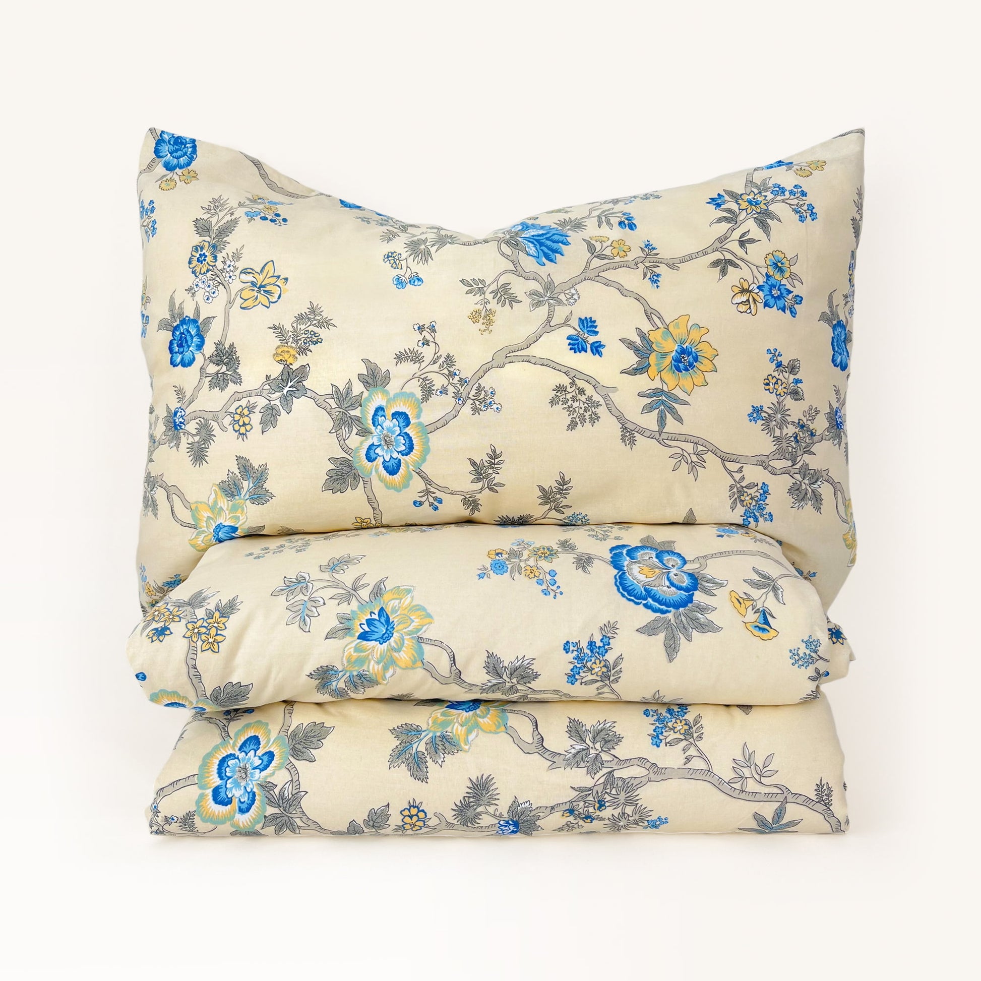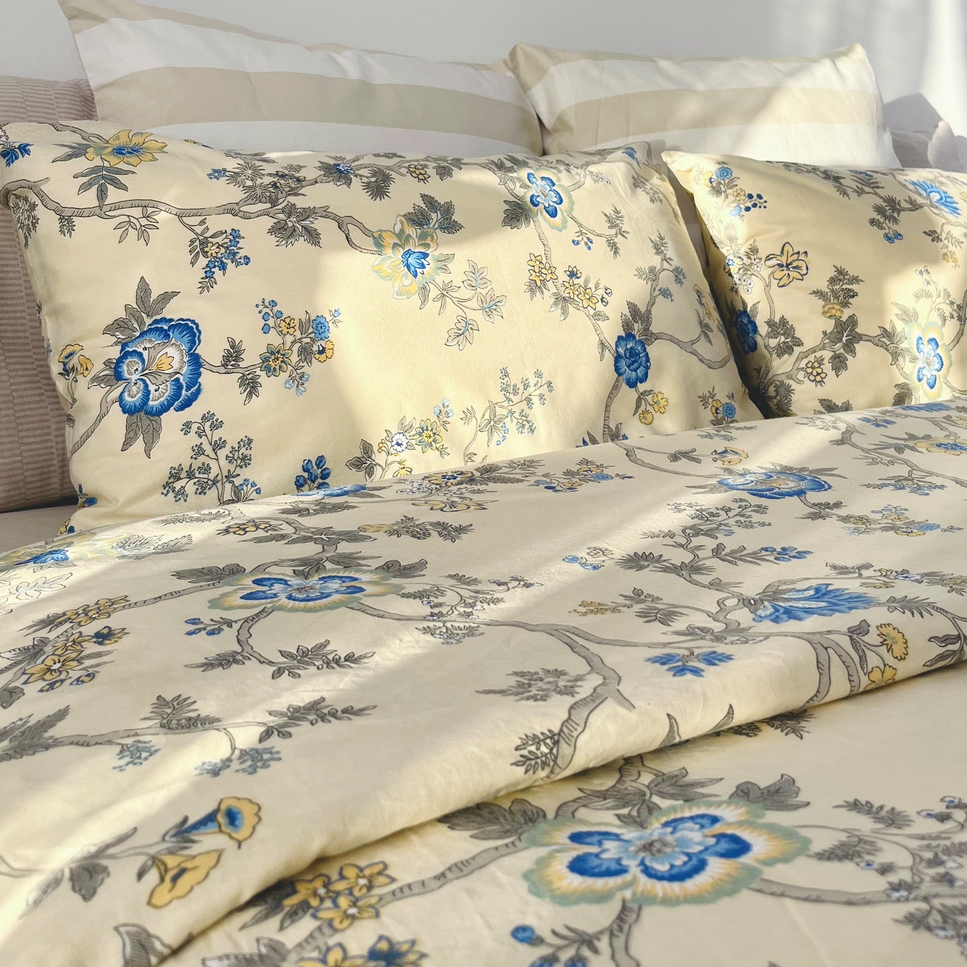 Magnoli, made from pure cotton, nurtures harmony and balance in your bedding experience. The intricate floral patterns in rich blue, infused into a soothing palette of calm beige, embrace a sense of serenity and a deep connection to nature. Enjoy long-lasting comfort as the cotton becomes softer with each wash, while our prints and colors maintain their vibrant allure even after countless cycles.