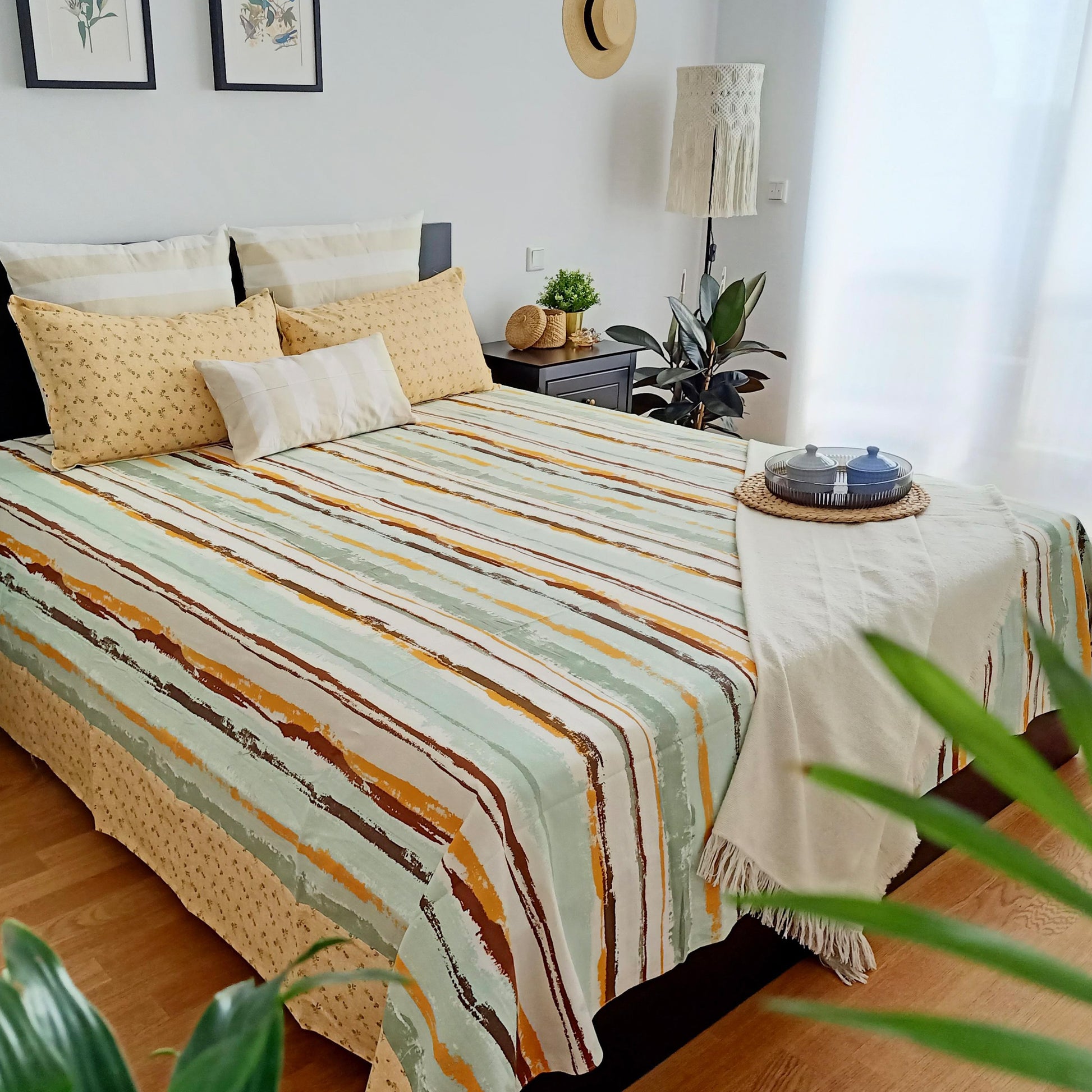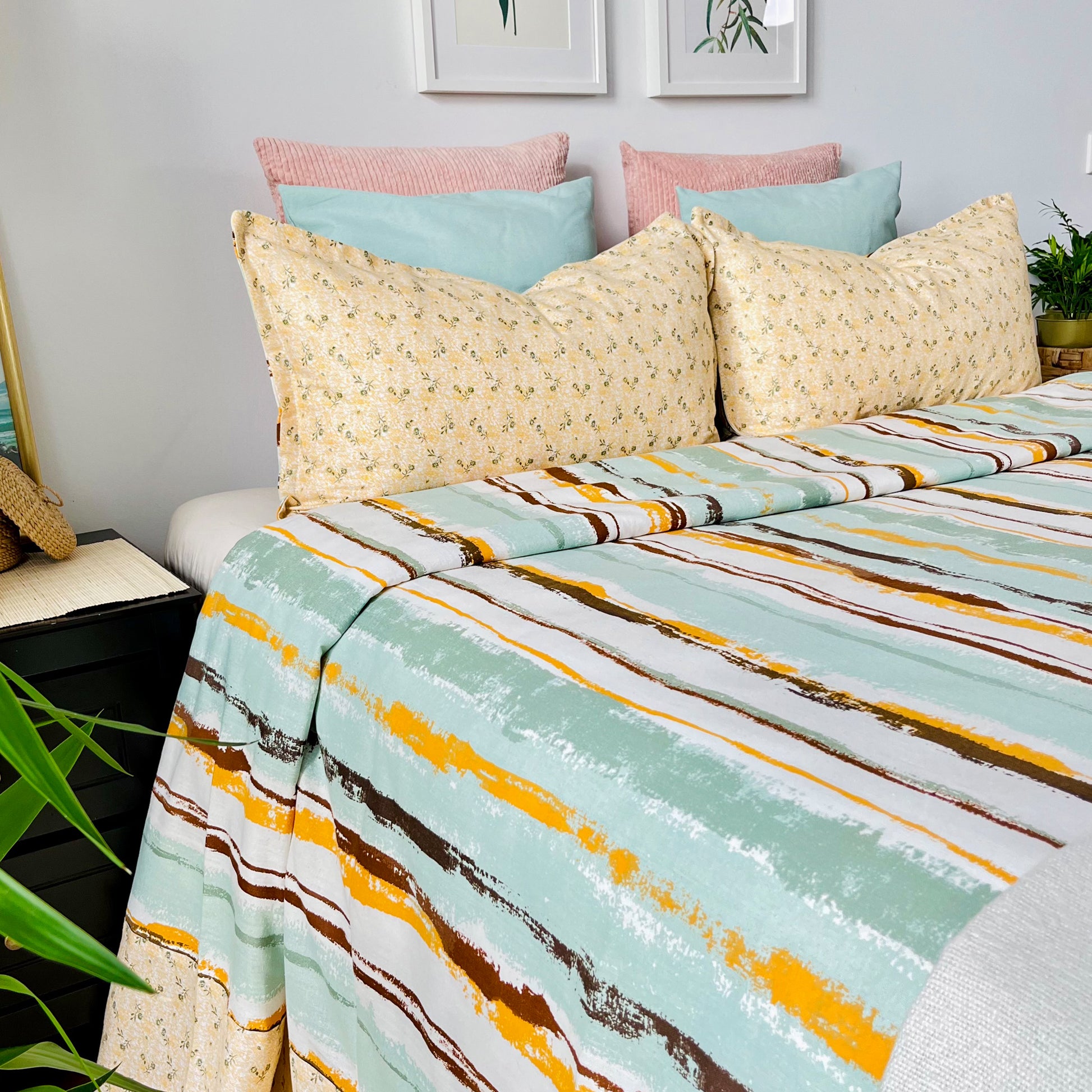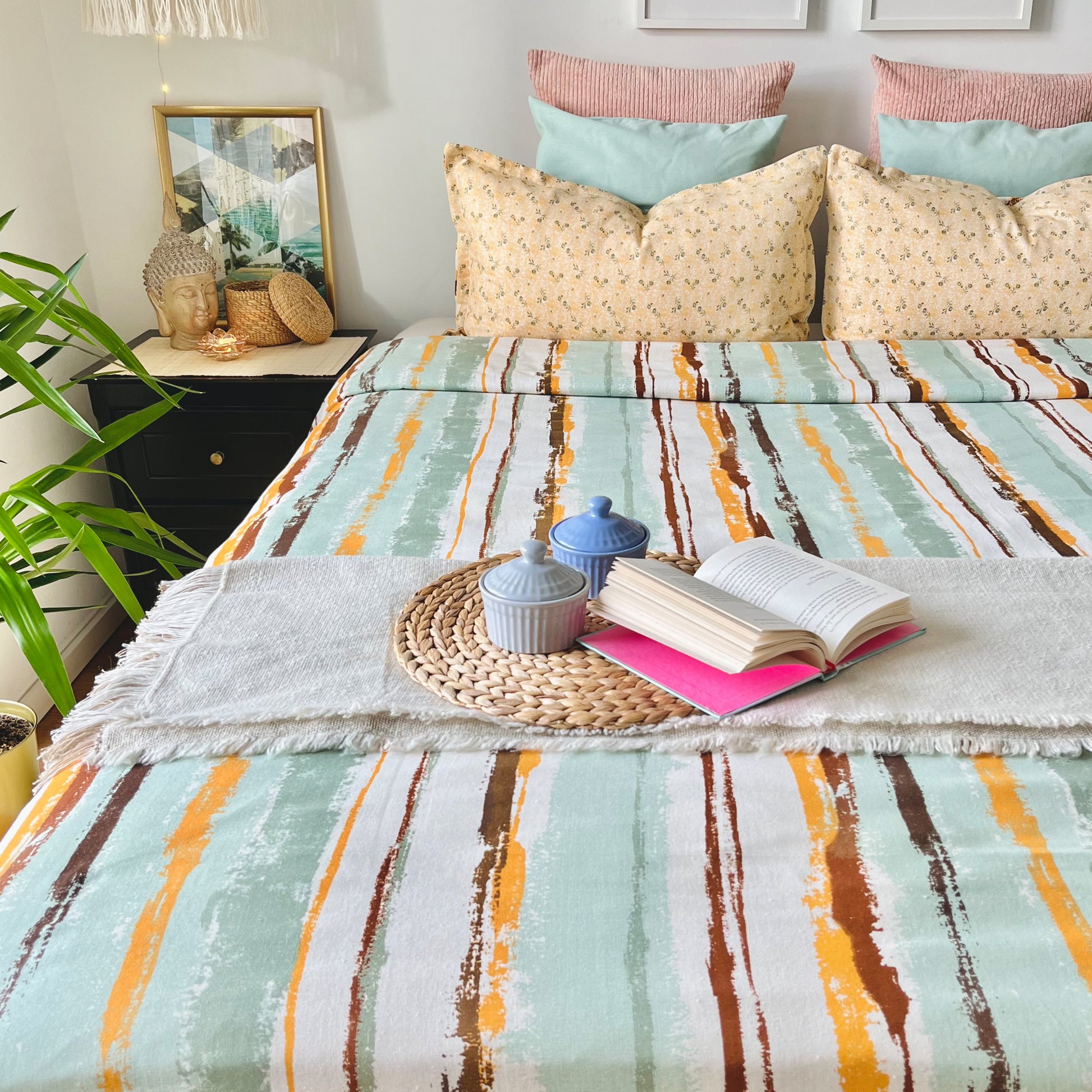 Our Ocean Hues bedcovers set brings a touch of tropical charm to any sleep space. It is featured in stylish wavy stripes and designed in pastel palette will add a pop of colors to your bedroom. So soft and breathable ensuring a comfortable sleep throughout the seasons. Our flat bedcovers are designed to be durable and easy to maintain. Spread it out over your mattress and tuck in the sides for a sleek and snug fit or let it hang through the sides to make your bed look fabulous with detailed designs on both the edges.