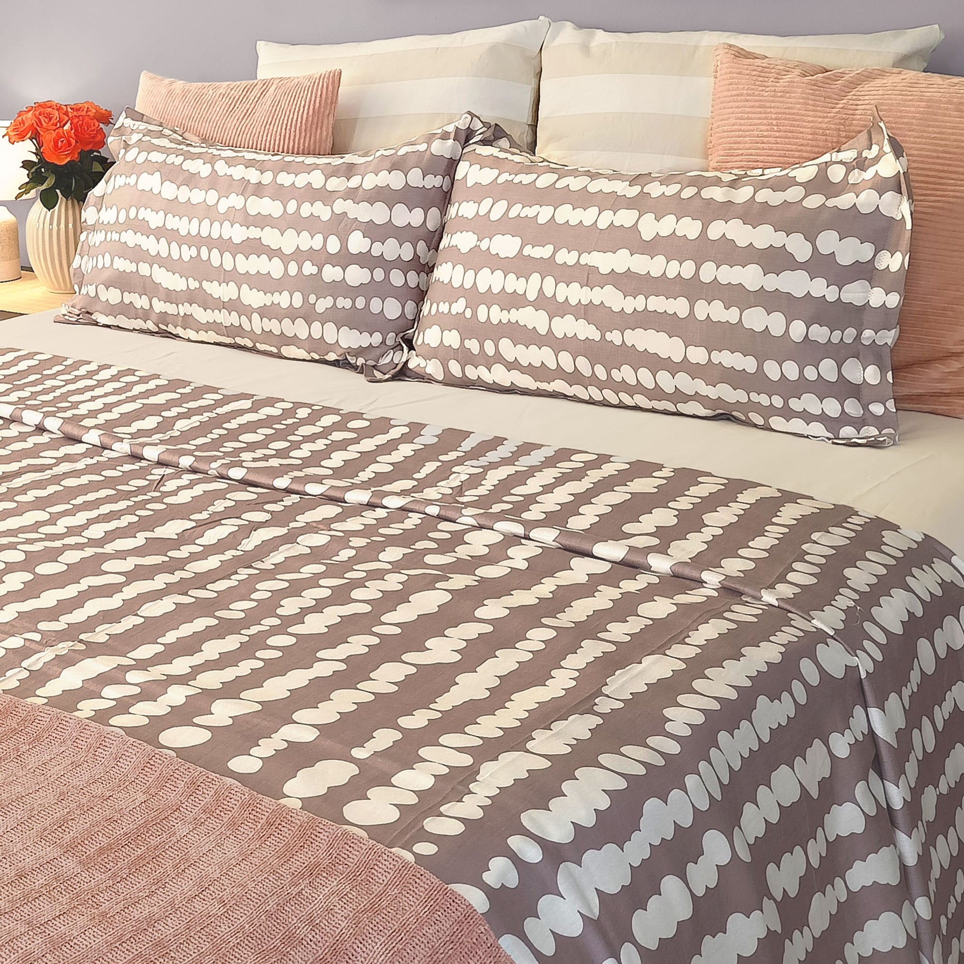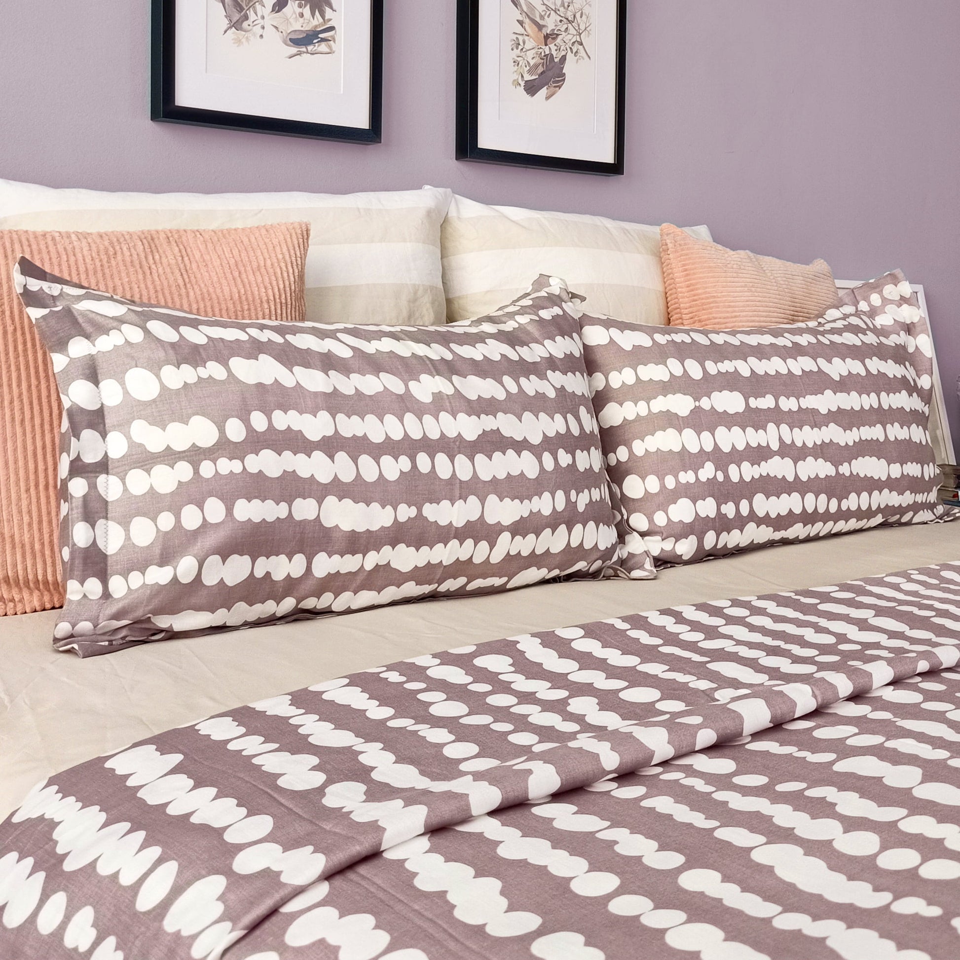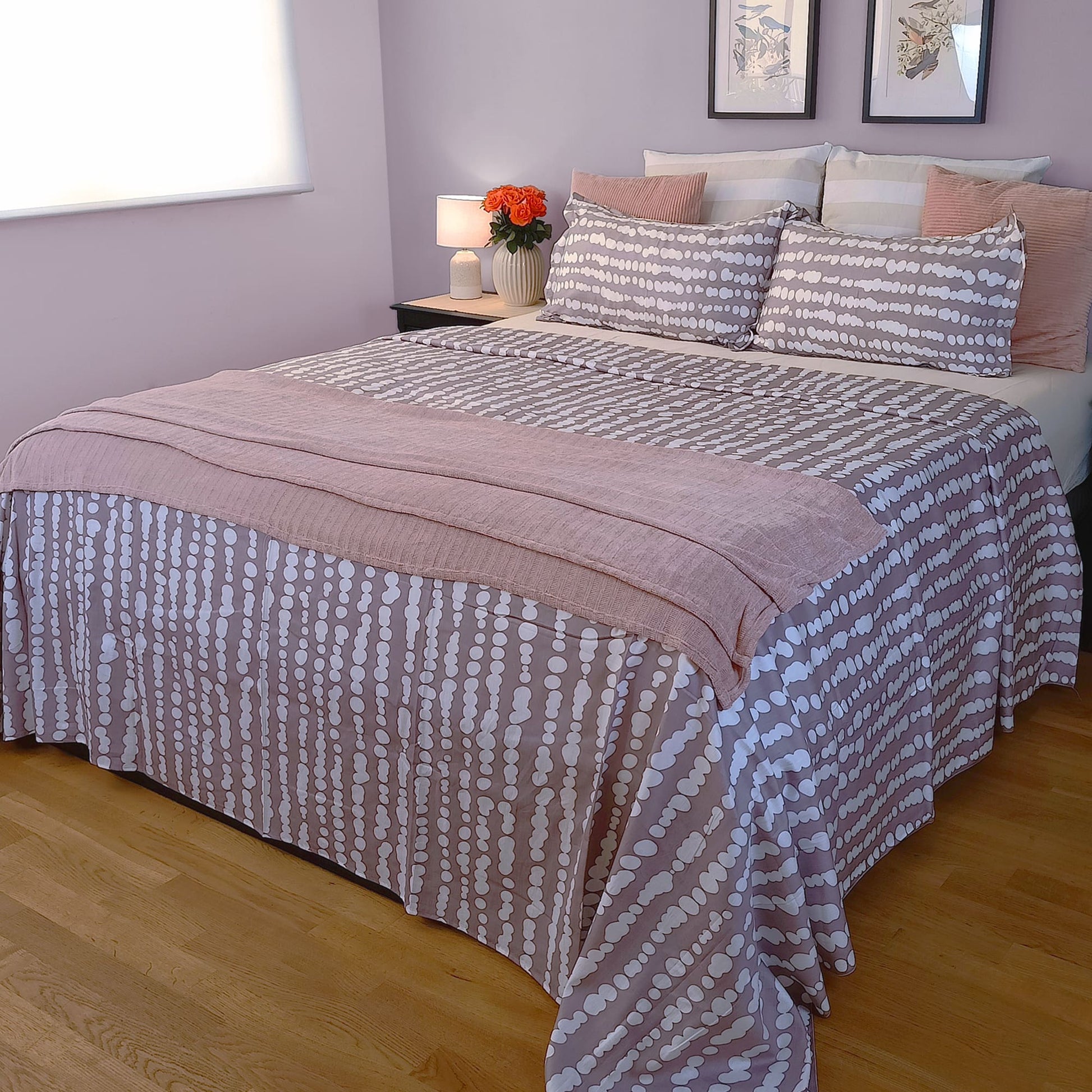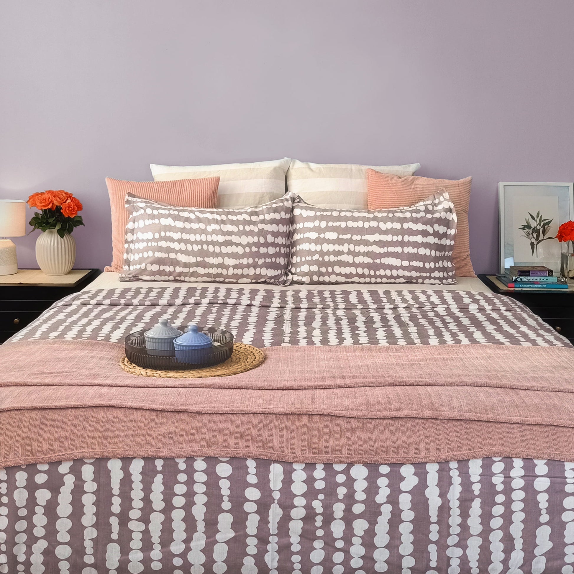 Leela is the fabulous dream-maker, crafted from smooth twill cotton that caresses your skin with utmost comfort. The Lilac color, paired with an everlasting abstract polka design, brings a chic and a modern vibe to any bedroom. The flat construction of Leela provides convenience and simplicity. Spread it out over your mattress and tuck in the sides for a sleek and cozy fit. For bold look, let it hang through the sides and watch your bed make a grand statement.