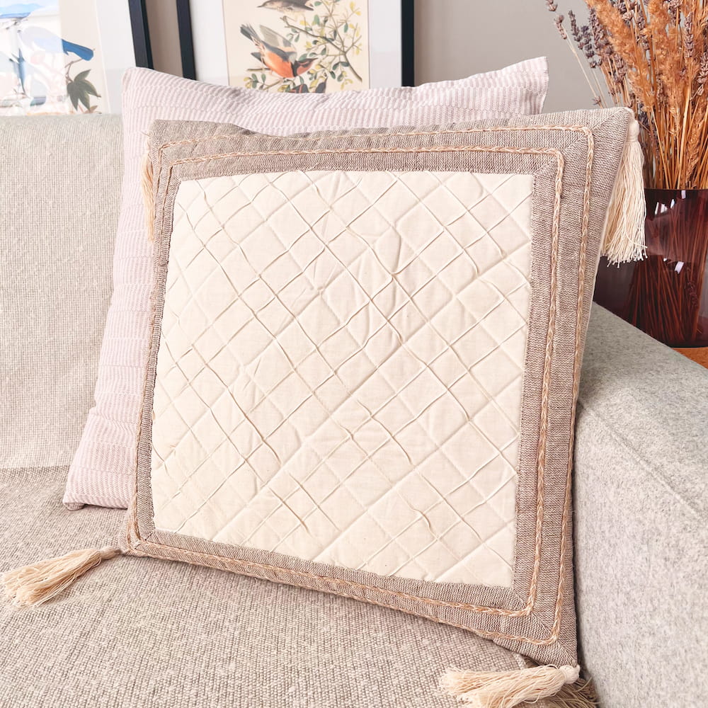 Our eco-friendly organic cotton cushion covers are sustainably handcrafted by skilled artisans in India. The appliqué artwork combined with jute and cotton brings a boho flair to your decor. The earthy beige and off-white colors make them easy to mix and match with other hues. For treating yourself or gifting a new homeowner friend, these cushion covers makes a perfect choice to add elegance to any space.